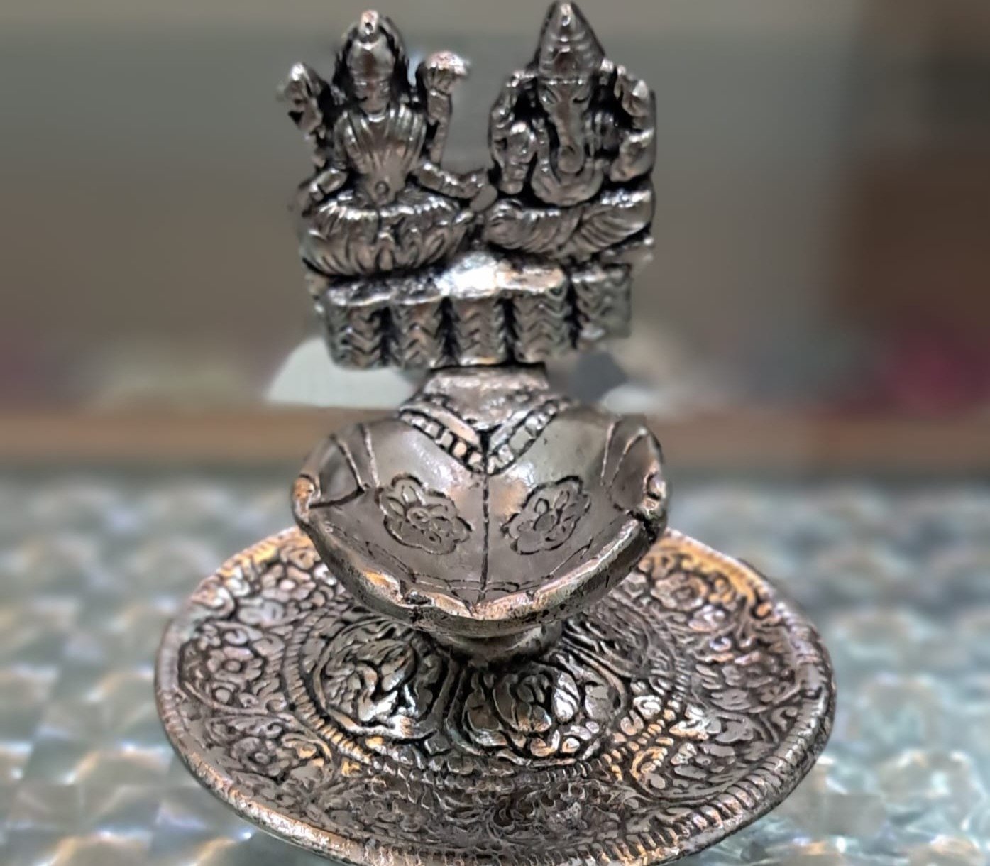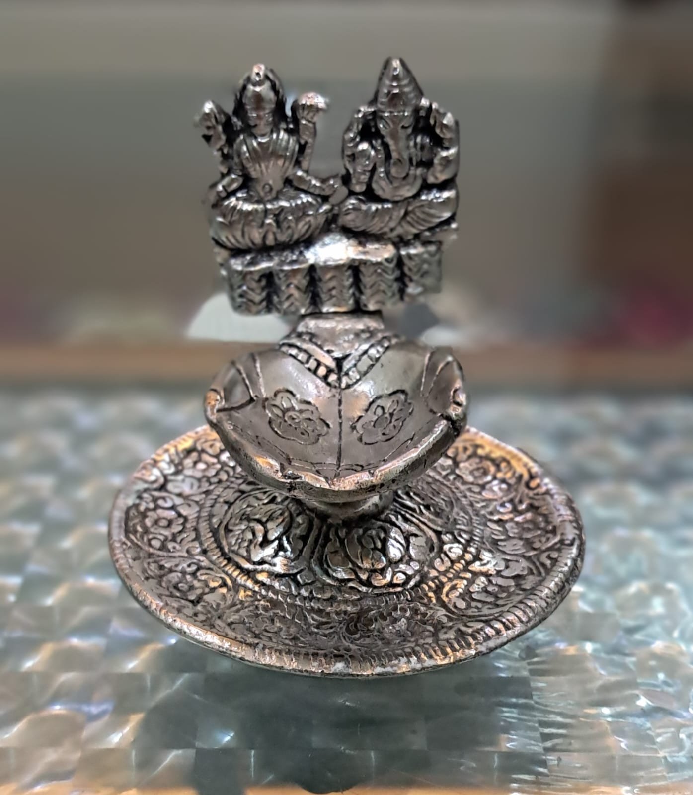 • 🙏 Design: Dual idols of Lord Ganesha & Goddess Lakshmi with intricate carving details