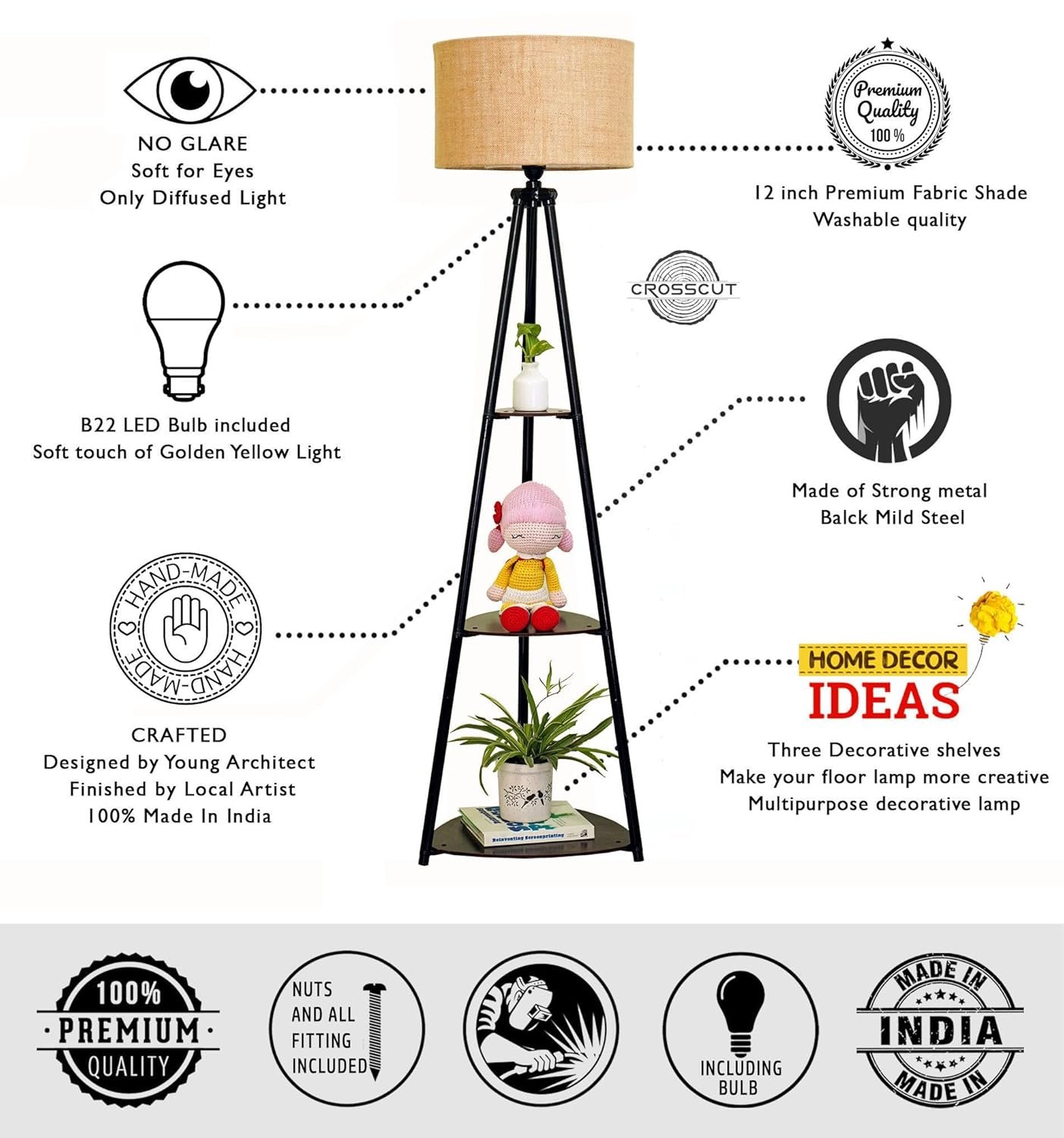 More than just a lighting solution, this multi-purpose floor lamp makes an excellent gifting option for housewarmings, anniversaries, weddings, or festive occasions. Durable, space-saving, and visually appealing, the Crosscut Furniture tripod lamp effortlessly elevates everyday décor while adding comfort and character to your home.