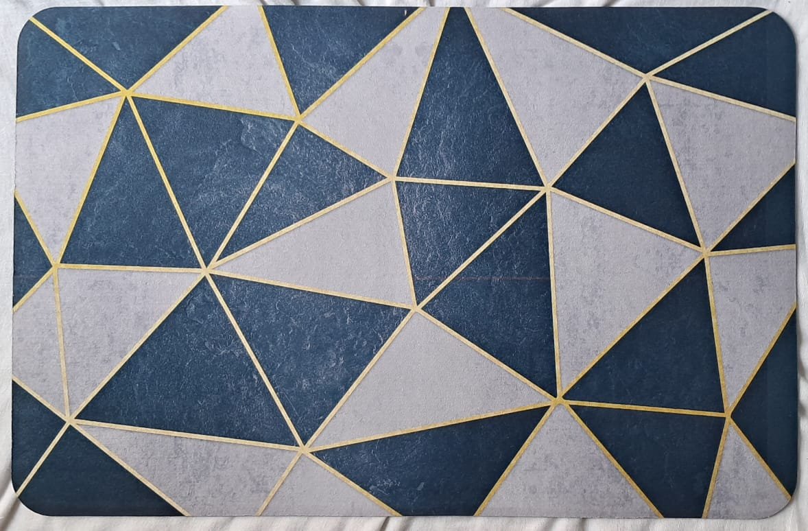 Add a touch of elegance and style to your home with this modern bathroom and kitchen floor mat featuring a navy blue & grey triangle pattern outlined with golden lines. Crafted with soft microfiber fabric and a non-slip rubber backing, this mat combines safety, durability, and modern aesthetics.