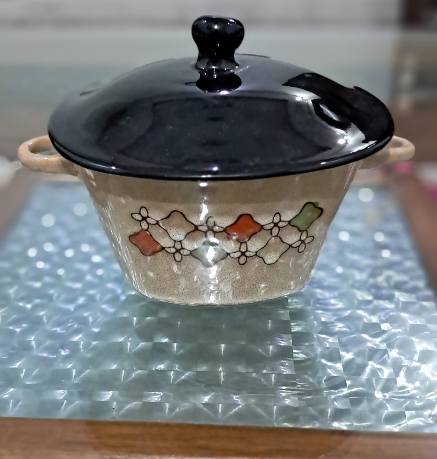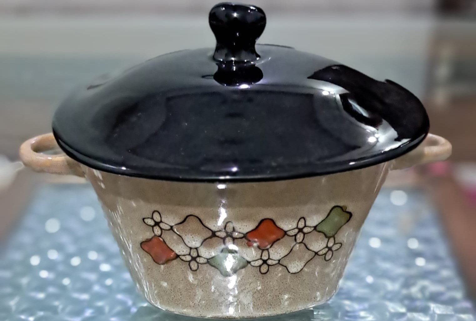 Designed with artistic flair, these pots feature a cream base with colorful floral motifs and a contrasting glossy black lid. The wooden-style handles give a rustic yet elegant touch, making them perfect for everyday meals or special gatherings.