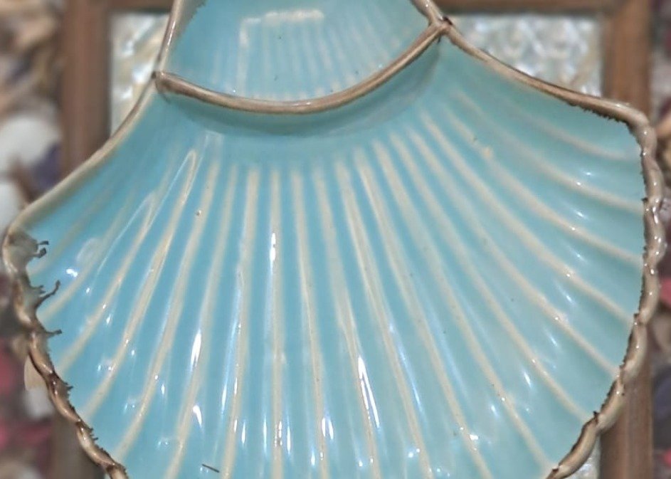 Expertly handcrafted by skilled artisans, this premium-quality ceramic dish captures the natural shape and texture of a seashell, finished in a glossy aqua blue glaze with beige-toned edges.